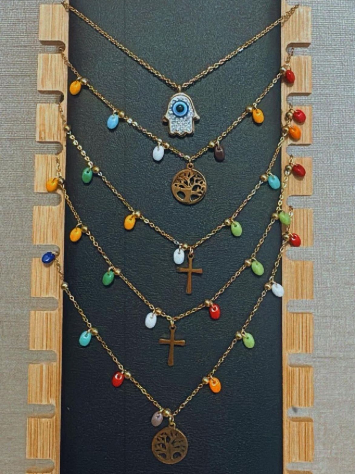 Eleva tu estilo con estos collares de acero inoxidable, resistentes, modernos y llenos de significado. Cada diseño combina dijes simbólicos con cuentas de colores que aportan un toque alegre y único a tu look.
